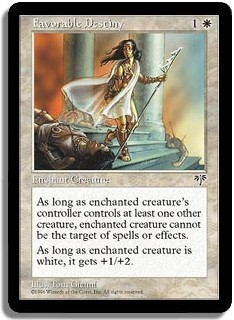 As long as enchanted creature's controller controls at least one other creature, enchanted creature cannot be the target of spells or effects. As long as enchanted creature is white, it gets +1/+2.