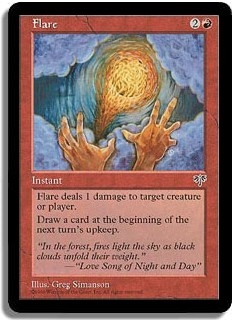 Flare deals 1 damage to target creature or player. Draw a card at the beginning of the next turn's upkeep.
