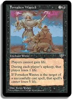 Players cannot gain life. During each player's upkeep, that player loses 1 life. If Forsaken wastes is the target of a successfully cast spell, that spell's caster loses 5 life.