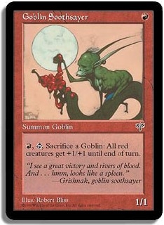 <R,T, Sacrifice a Goblin>: All red creatures get +1/+1 until end of turn.