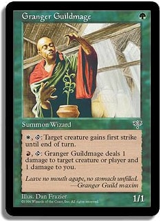 <W,T>: Target creature gains first strike until end of turn. <R,T>: Granger Guildmage deals 1 damage to target creature or player and 1 damage to you.