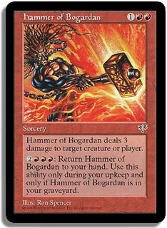 Hammer of Bogardan deals 3 damage to target creature or player. <2RRR>: Return Hammer of Bogardan to your hand. Use this ability only during your upkeep, and only if Hammer of Bogardan is in your graveyard.