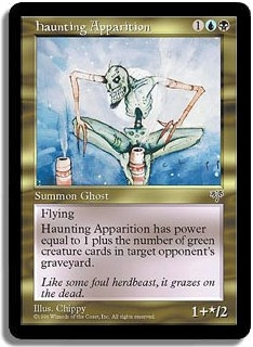 Flying. Haunting Apparition has power equal to 1 plus the number of green creature cards in target opponent's graveyard.