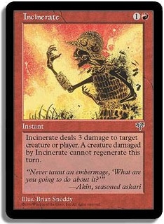 Incinerate deals 3 damage to target creature or player. A creature damaged by Incinerate cannot regenerate this turn.