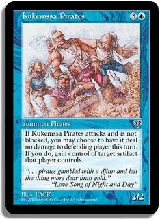 If Kukemssa Pirates attacks and is not blocked, you may choose to have it deal no damage to defending player this turn. If you do, gain control of target artifact that player controls.