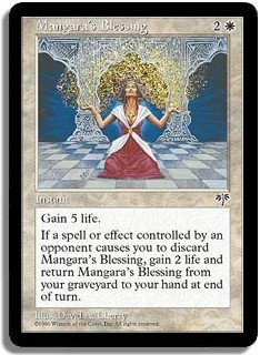 Gain 5 life. If a spell or effect by an opponent causes you to discard Mangara's Blessing, gain 2 life and return Mangara's Blessing from your graveyard to your hand at end of turn.