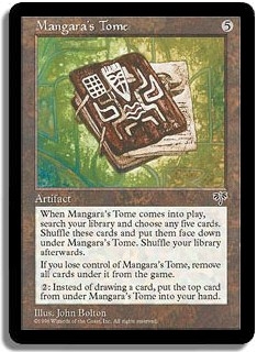 When Mangara's Tome comes into play, search your library and choose any five cards. Shuffle these cards and put them face down under Mangara's Tome. Shuffle your library afterwards. If you lose control of Mangara's Tome, remove all cards under it from the game. <2>: Instead of drawing a card, put the top card from under Mangara's Tome into your hand.