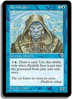 <1U>: Draw a card. Use this ability only when Merfolk Seer is put into the graveyard from play and only once.