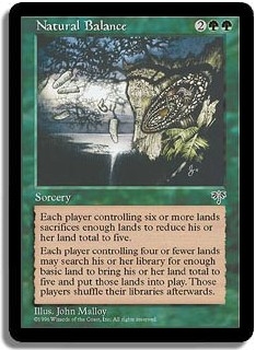 Each player controlling six or more lands sacrifices enough lands to reduce his or her land total to five. Each player controlling four or fewer lands may search his or her library for enough basic land to bring his or her land total to five and put those lands into play. Those players shuffle their library afterwards.