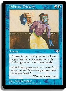 Choose target land you control and target land an opponent controls. Exchange control of these lands.