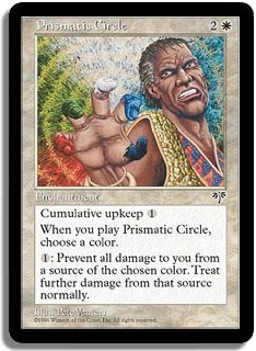 Cumulative Upkeep <1>. When you play Prismatic Circle, choose a color. <1>: Prevent all damage to you from a source of the chosen color. Treat further damage from that source normally.