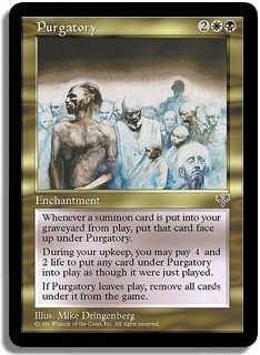 Whenever a summon card is put into your graveyard from play, put that card face up under Purgatory. During your upkeep, you may pay <4> and 2 life to put any card under Purgatory into play as though it were just played. If Purgatory leaves play, remove all cards under it from the game.
