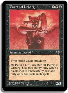 First strike when attacking. <B>: Put a +1/+1 counter on Purraj of Urborg. Use this ability only when a black spell is successfully cast and only once for each such spell.