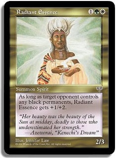 As long as target opponent controls any black permanents. Radiant Essence gets +1/+2.