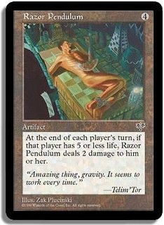At the end of each player's turn, if any player has 5 or less life, Razor Pendulum deals 2 damage to him or her.