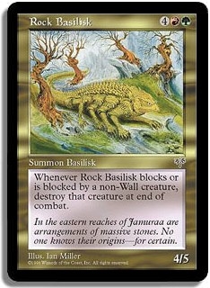 Whenever Rock Basilisk blocks or is blocked by a non-wall creature, destroy that creature at end of combat.