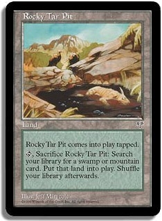 Comes into play tapped. <T>: Sacrifice Rocky Tar Pit to search your library for a swamp or mountain. Put that land into play. Shuffle your library afterwards.