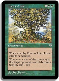 When you play Roots of Life, choose islands or swamps. Whenever a land of the chosen type that target opponent controls becomes tapped, gain 1 life.