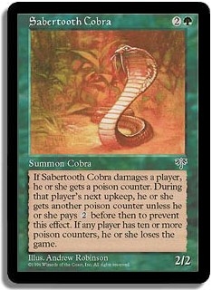 If Sabertooth Cobra damages a player, he or she gets a poison counter. During that player's next upkeep, he or she gets another poison counter unless he or she pays 2 before then to prevent this effect. If any player has ten or more poison counters, he or she loses the game.