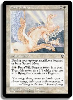 During your upkeep, sacrifice a Pegasus or bury Sacred Mesa. <1W>: Put a Wild Pegasus token into play. Treat this token as a 1/1 white creature with flying that counts as a Pegasus.