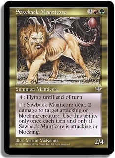 <4>: Flying until end of turn. <1>: Sawback Manticore deals 2 damage to target attacking or blocking creature. use this ability only once each turn and only if Sawback Manticore is attacking or blocking.