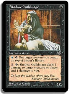 <U,T>: Put target creature you control on top of owner's library. <R,T>: Shadow Guildmage deals 1 damage to target creature or player and 1 damage to you.