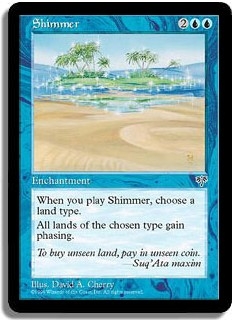 When you play Shimmer, choose a land type. All lands of the chosen type gain phasing.