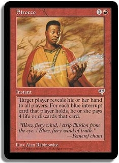 Target player reveals his or her hand to all players. For each blue interrupt card that player holds, he or she pays 4 life or discards that card.
