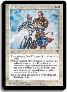 When you play Soul Echo, put X echo counters on it. At the beginning of your upkeep, if there are no echo counters on Soul Echo bury it; otherwise, target opponent may choose that for each 1 damage dealt to you until your next upkeep, you instead remove 1 echo counter from Soul Echo. You do not lose the game as a result of having less than 1 life.
