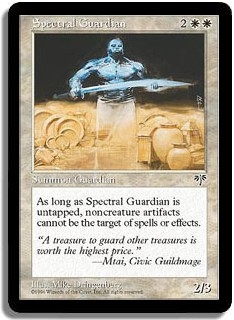 As long as Spectral Guardian is untapped, noncreature artifacts cannot be the target of spells or effects.