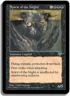 Flying, Trample, Protection from black. First strike when attacking. Spirit of the Night is unaffected by summoning sickness.