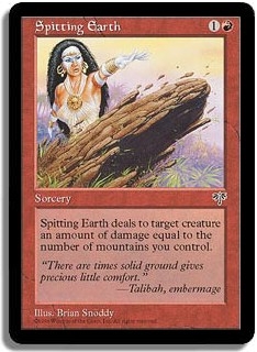 Spitting Earth deals to target creature an amount of damage equal to the number of mountains you control.
