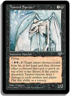 Flying. <1BB,T>: Target player chooses a card from his or her hand and then chooses either to discard that card or put it on top of his or her library. If the card is discarded, Tainted Specter deals 1 damage to each creature and player. Play this ability as a sorcery.