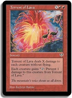 Torrent of Lava deals X damage to each creature without flying. Each creature gains "<T>: Prevent 1 damage to this creature from Torrent of Lava."