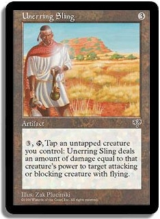 <3,T, Tap an untapped creature you control>: Unerring Sling deals an amount of damage equal to that creature's power to target attacking or blocking creature with flying.