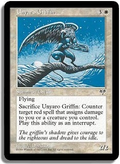 Flying. <Sacrifice Unyaro Griffin>: Counter target red spell that assigns damage to you or a creature you control. Play this ability as an interrupt.