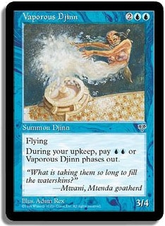 Flying. During your upkeep, pay <UU> or Vaporous Djinn phases out.