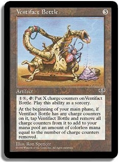 <1X,T>: Put X charge counters on Ventifact Bottle. Play this ability as a sorcery. At the beginning of your main phase, if Ventifact Bottle has any charge counters on it, tap Ventifact Bottle and remove all charge counters from it to add to your mana pool an amount of colorless mana equal to the number of charge counters removed.