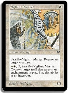 <Sacrifice Vigilant Martyr>: Regenerate target creature. <WW,T, Sacrifice Vigilant Martyr>: Counter target spell that targets an enchantment in play. Play this ability as an interrupt.
