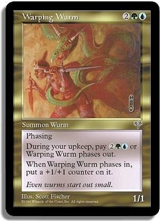 Phasing. During your upkeep, pay <2UG> or Warping Wurm phases out. When Warping Wurm phases in, put a +1/+1 counter on it.