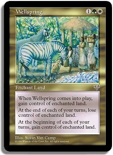 When Wellspring comes into play, gain control of enchanted land. At the end of each of your turns, lose control of enchanted land. At the beginning of each of your turns, gain control of enchanted land.