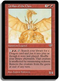 <1RR,T>: Search your library for a Dragon card and put it into play as though it were just played. Shuffle your library afterwards. That creature is unaffected by summoning sickness. Remove the creature from the game at the end of any turn.