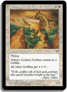 Flying. Zuberi, Golden Feather counts as a Griffin. All other Griffins get +1/+1.