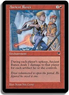 During each player's upkeep, Ancient Runes deals 1 damage to that player for each artifact he or she controls.