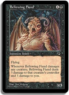 Flying. Whenever Bellowing Fiend damages any creature, Bellowing Fiend deals 3 damage to that creature's controller and 3 damage to you.