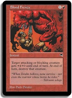 Target attacking or blocking creature gets +4/+0 until end of turn. At end of turn, destroy that creature.