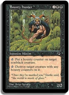 <T>: Put a bounty counter on target nonblack creature. <T>: Destroy target creature with any bounty counters on it.