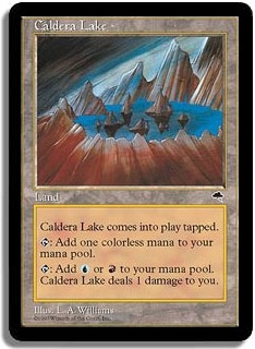 Caldera Lake comes into play tapped. <T>: Add one colorless mana to your mana pool. <T>: Add <U> or <R> to your mana pool. Caldera Lake deals 1 damage to you.