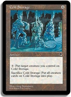 <3>: Put target creature you control on Cold Storage. <Sacrifice Cold Storage>: Put all creature cards on Cold Storage into play.