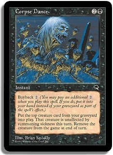 Buyback <2>. Put the top creature card from your graveyard into play. That creature is unaffected by summoning sickness this turn. Remove that creature from the game at the end of turn.